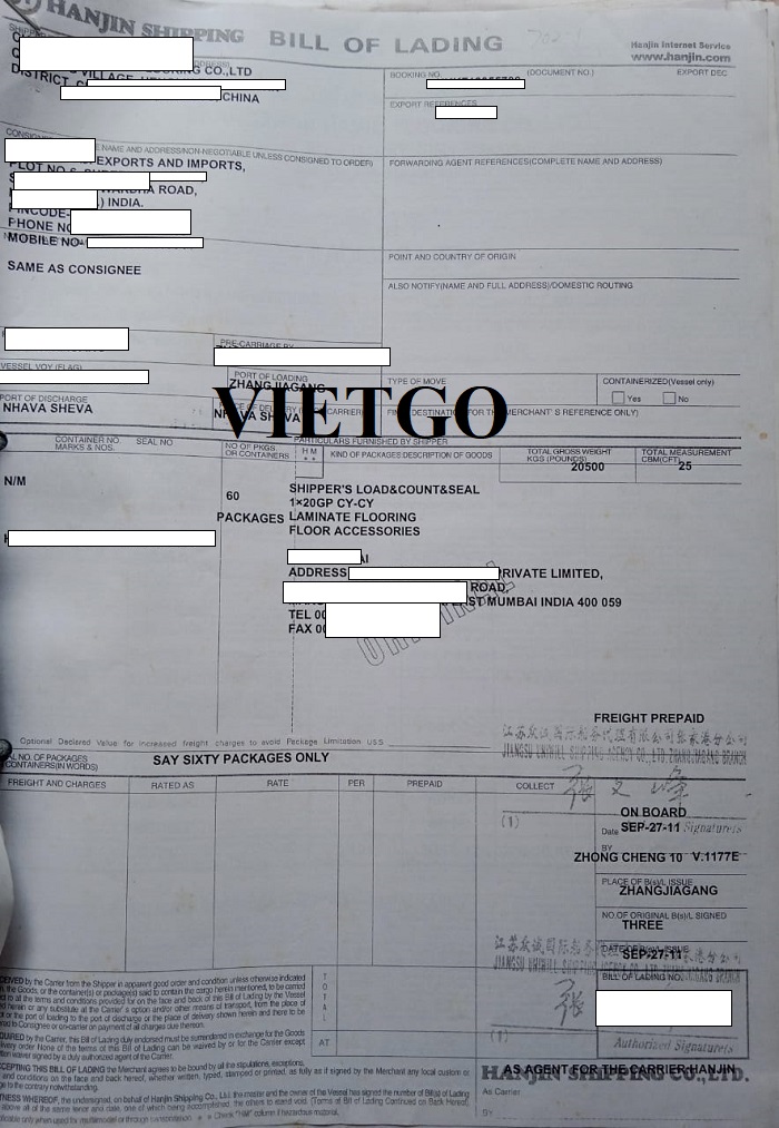 Dưới đây là hình ảnh bản vận đơn nhập khẩu phụ kiện sàn từ Trung Quốc vào ngày 27/11/2022 mà công ty vị khách hàng đã nhập khẩu thành công: