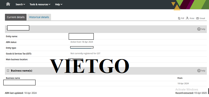 Hình ảnh thông tin vị khách hàng trên trang web chính thức của Cơ quan đăng ký doanh nghiệp Úc