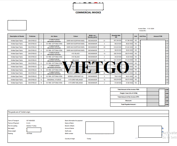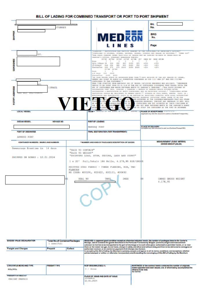 Hình ảnh vận đơn nhập khẩu vải may mặc ngày 12/1/2024 từ Thổ Nhĩ Kỳ của công ty vị khách hàng