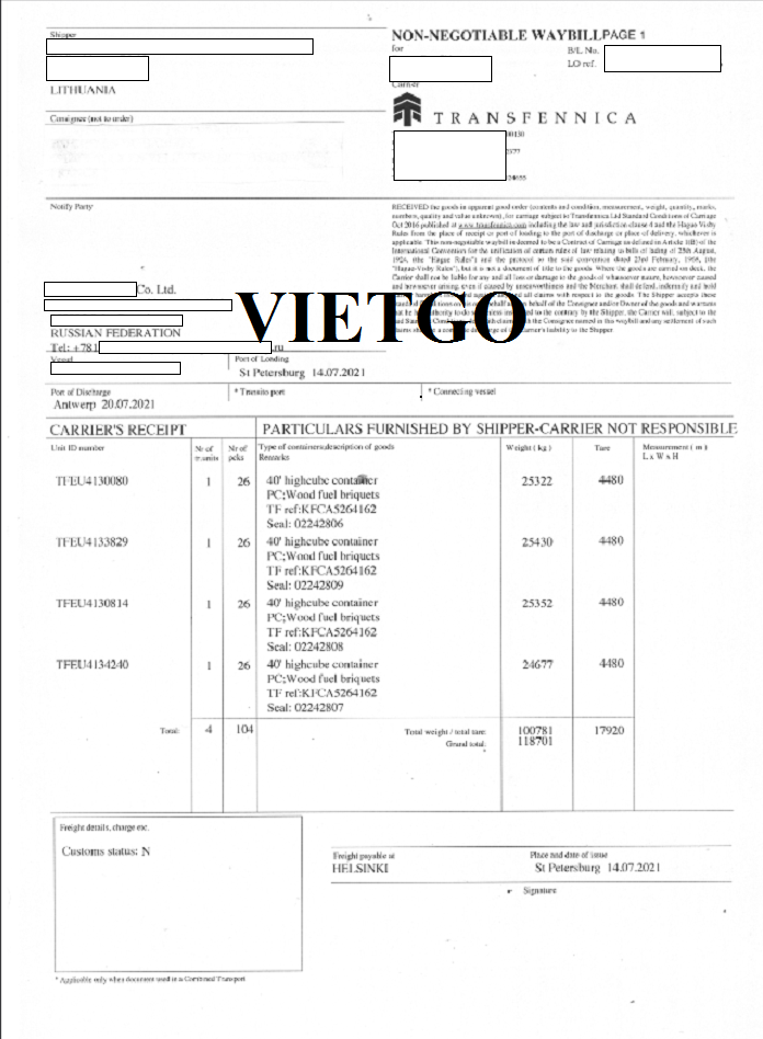 Hình ảnh vận đơn nhập khẩu củi mùn cưa ép từ Nga sang Bỉ do công ty vị khách hàng thực hiện vào 14/07/2021