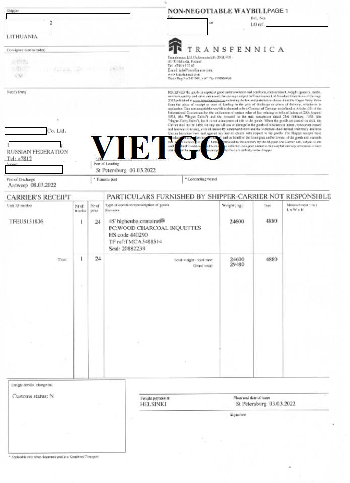 Hình ảnh vận đơn nhập khẩu than củi mùn cưa từ Nga sang Bỉ do công ty vị khách hàng thực hiện vào 03/03/2022