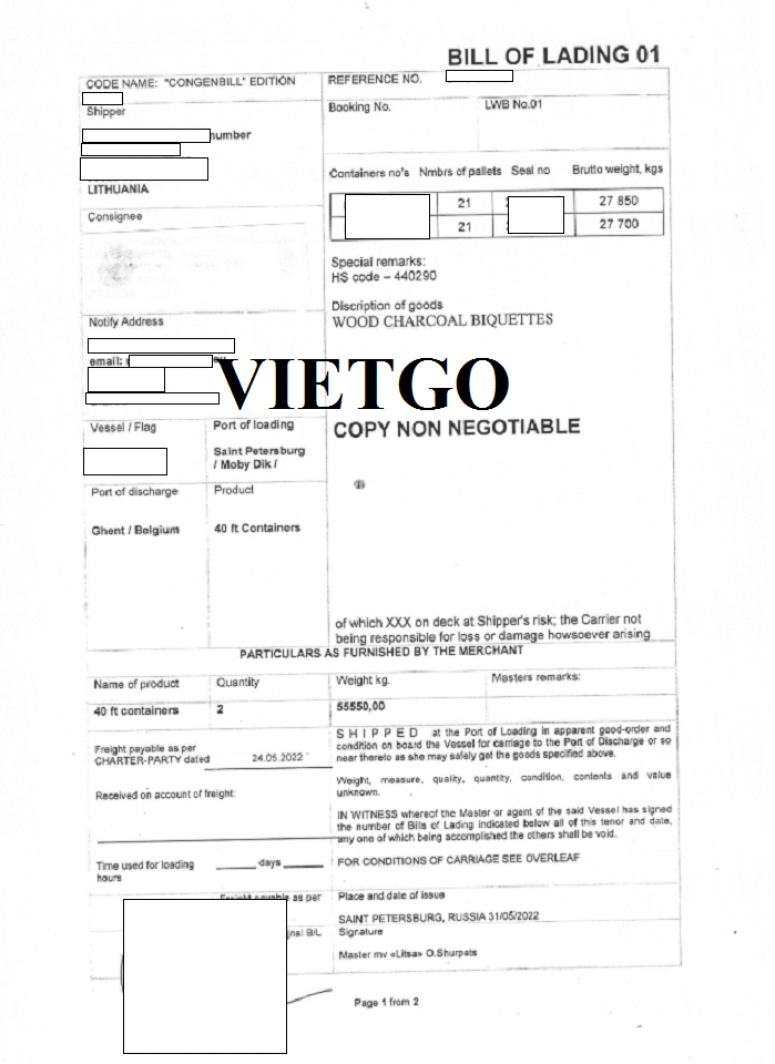 Hình ảnh vận đơn nhập khẩu than củi mùn cưa từ Nga sang Bỉ do công ty vị khách hàng thực hiện vào 31/05/2022