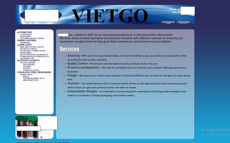 Trong lĩnh vực phụ tùng ô tô, công ty cung cấp các sản phẩm như thảm sàn ô tô, móc khóa, và bọc vô lăng. Đối với lĩnh vực hàng tiêu dùng, ████████████████████phân phối các sản phẩm thiết thực như bình nước bằng thép không gỉ, đèn xe đạp và các sản phẩm gia dụng khác. Với hơn 983 lô hàng nhập khẩu kể từ năm 2007 công ty không ngừng mở rộng quy mô hoạt động và cam kết mang đến các sản phẩm chất lượng cao, giá cả cạnh tranh cùng dịch vụ hậu mãi chuyên nghiệp.