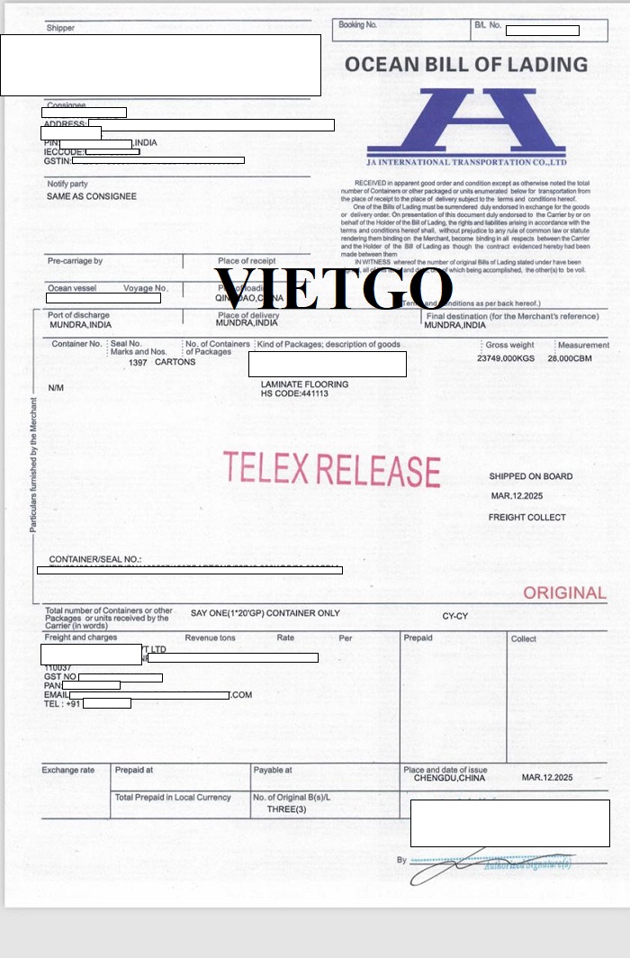 Dưới đây là hình ảnh bản vận đơn vị khách hàng đã nhập khẩu thành công sản phẩm ván sàn vào ngày 12 tháng 3 năm 2025 từ cảng Qingdao, Trung Quốc đến cảng Mundra, Ấn Độ.