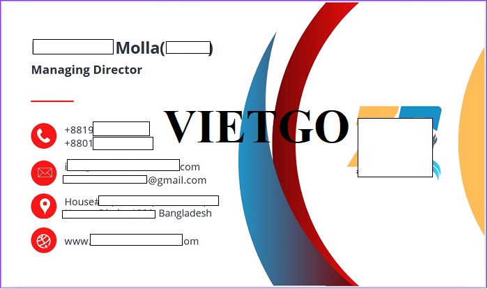 Được biết ông Molla hiện đang là Giám đốc của công ty ██████████ – một công ty xuất nhập khẩu và phân phối một số mặt hàng như hạt tiêu, thảo quả, dừa khô, đinh hương, thì là, v.v. tại thị trường Bangladesh. Công ty tuy chưa hoạt động được nhiều năm nhưng danh tiếng của ██████████ được nhiều khách hàng nội địa biết đến. Điều này, được xây dựng vững chắc dựa trên dịch vụ chăm sóc khách hàng tận tâm và cung cấp các sản phẩm chất lượng cao của ██████████. Với tư cách là một nhà phân phối sản phẩm nông sản, ông nhận thấy rõ tầm quan trọng của chất lượng sản phẩm đối với người tiêu dùng nên vị khách hàng luôn chú trọng nguồn chất lượng tốt khi nhập khẩu..