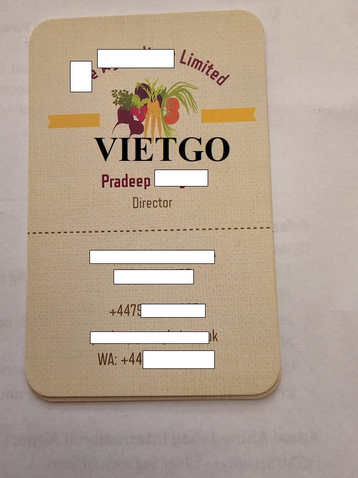 Ông Pradeep ██████████ - vị khách hàng của VIETGO lần này đại diện mua hàng đến từ Anh. Hiện tại ông đang là Giám đốc của công ty ██████████, có trụ sở tại Stamore, Anh. Ông chia sẻ rằng ông đã có hơn 20 năm kinh nghiệm trong việc nhập khẩu tỏi vào thị trường Anh. Hiện tại, ngoài Trung Quốc ông đang tìm kiếm các nhà cung cấp tỏi từ các quốc gia khác đặc biệt là Việt Nam. Ông hy vọng có thể tiến hành chuyến hàng sớm nhất do đó ông mong rằng VIETGO có thể giúp ông kết nối với nhiều nhà cung cấp lớn, uy tín để có thể hợp tác lâu dài trong tương lai.