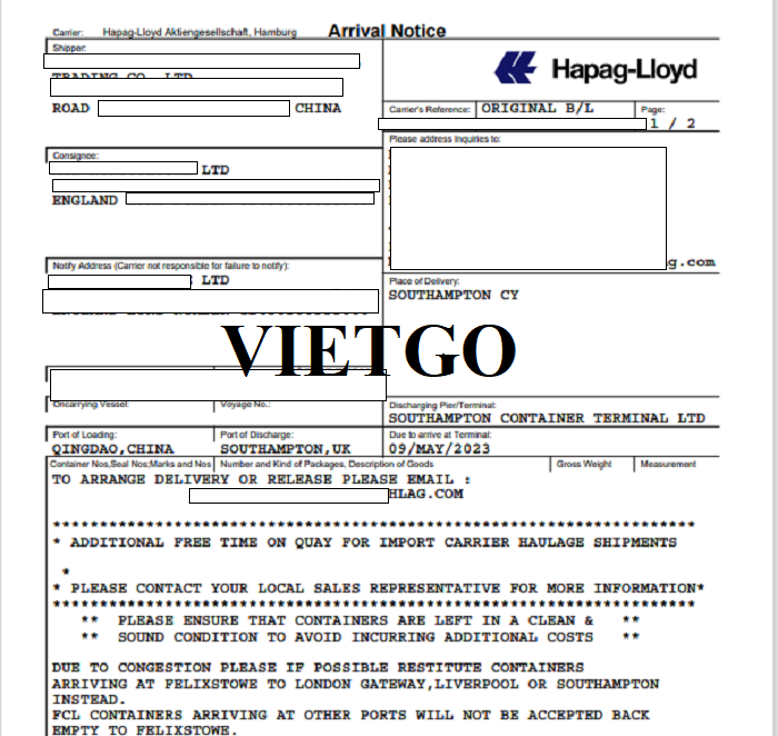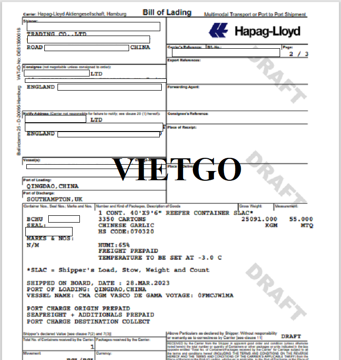 Dưới đây là hình ảnh bản vận đơn nhập khẩu tỏi từ Trung Quốc và giấy thông báo hàng đến của vị khách hàng: