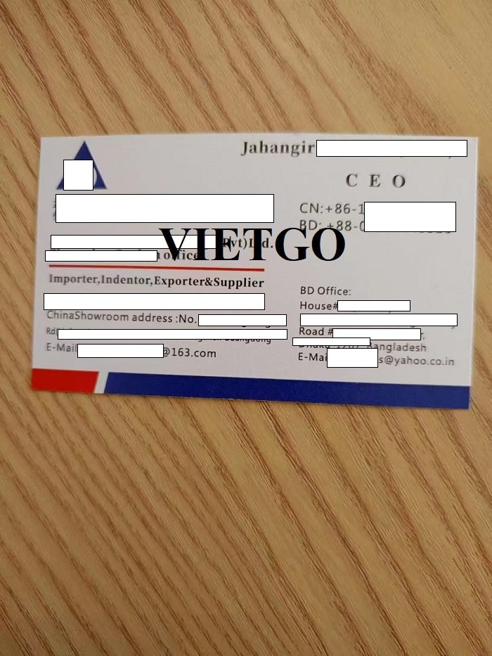 Qua cuộc trò chuyện cũng như trao đổi kỹ lưỡng về đơn hàng, Vietgo nhận thấy ông Jahangir là một vị khách hàng tiềm năng và là cơ hội để hợp tác lâu dài với các Nhà cung cấp châu Á. Vậy nên, Quý nhà cung cấp nào có thể đáp ứng được yêu cầu của vị khách hàng thân thiện này, vui lòng liên hệ và gửi báo giá cho ông qua trong thời gian sớm nhất có thể qua địa chỉ email dưới đây.