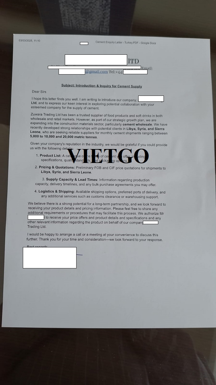 Ông Terzi – đại diện công ty ██████████ vừa qua đã liên hệ với VIETGO trao đổi về mong muốn tìm kiếm nhà cung cấp cho đơn hàng nhập khẩu xi măng sang thị trường Syria để phục vụ cho hoạt động kinh doanh của mình.
