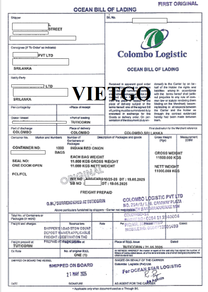 Hình ảnh vận đơn nhập khẩu hành từ Ấn Độ của công ty vị khách hàng vào tháng 5/2025