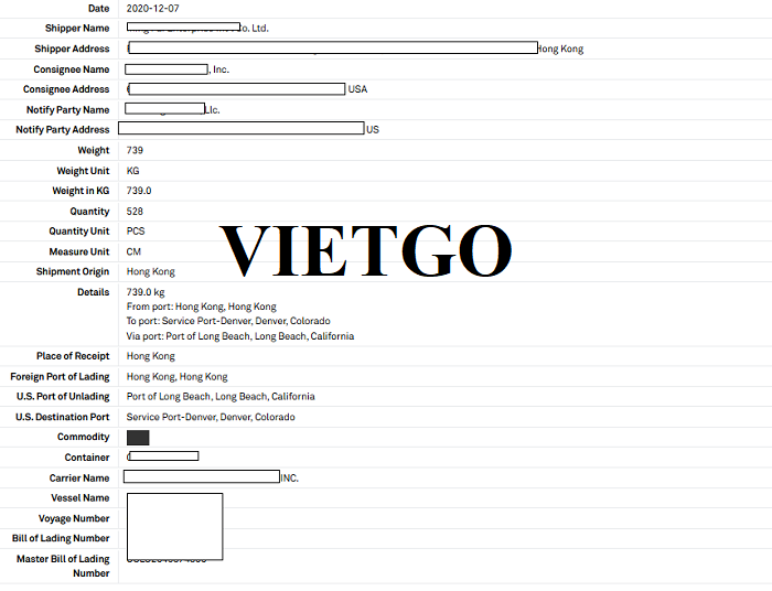 Hình ảnh thông tin vận đơn xuất khẩu hàng hóa từ Hồng Kông sang Mỹ do công ty thực hiện vào năm 2020