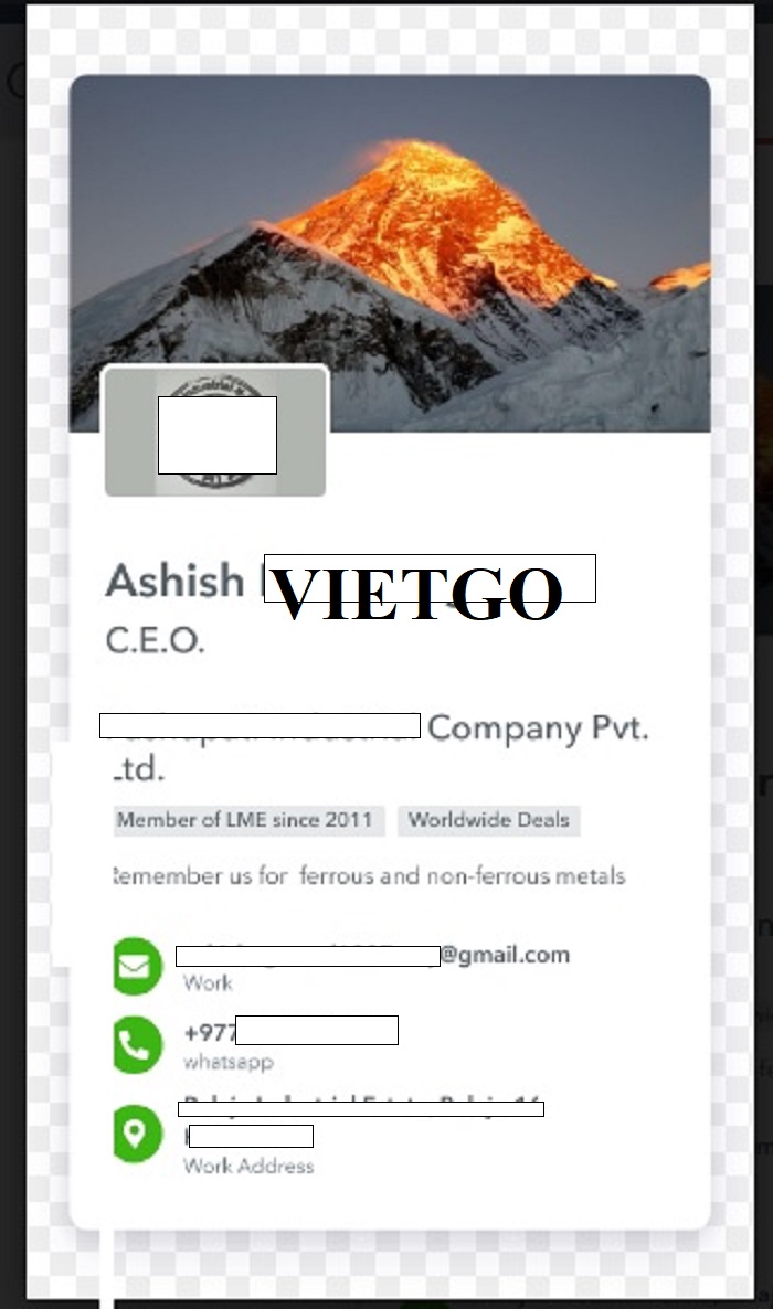 ██████████ Pvt. Ltd là là một doanh nghiệp uy tín có trụ sở tại ██████████, Nepal, chuyên hoạt động trong lĩnh vực kinh doanh kim loại đen và kim loại màu trên quy mô toàn cầu. Qua nhiều năm hoạt động và phát triển, công ty đã khẳng định được vị thế vững chắc của mình trong ngành công nghiệp kim loại không chỉ trong nước mà còn trên thị trường quốc tế.