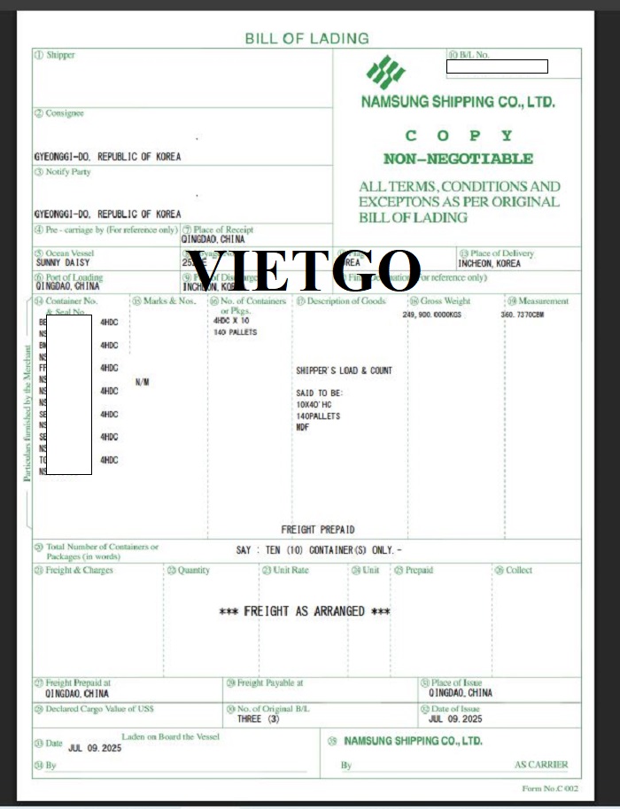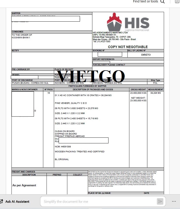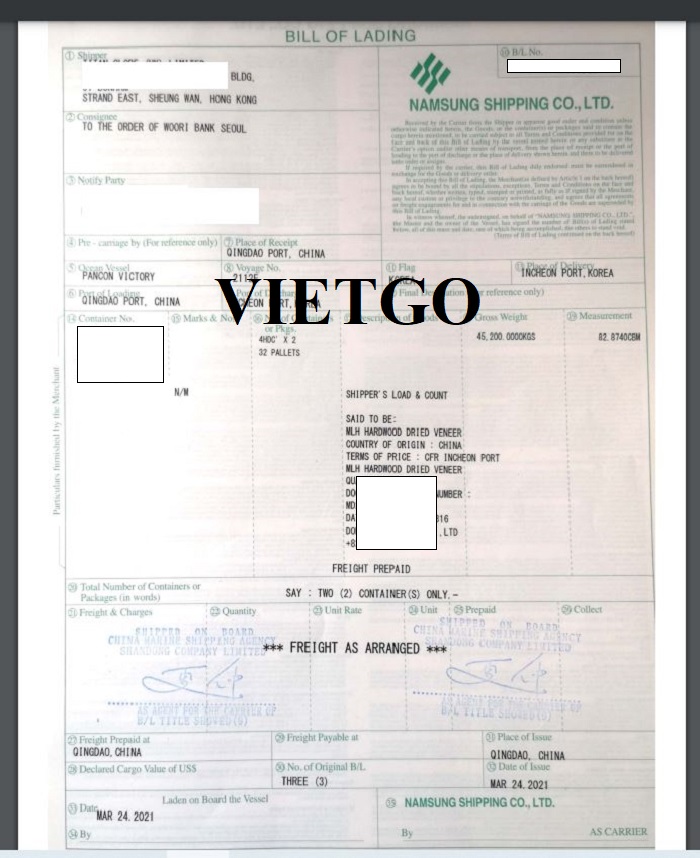 Với kinh nghiệm nhiều năm trong lĩnh vực cung ứng, công ty đã từng bước khẳng định vị thế của mình trên thị trường Hàn Quốc và quốc tế thông qua hoạt động nhập khẩu ổn định từ các thị trường lớn như Trung Quốc, Brazil, trong đó có nhiều lô hàng ván bóc, ván dăm và ván MDF đã được thực hiện thành công. Danh tiếng và uy tín của công ty được củng cố qua năng lực hậu cần vững mạnh và mạng lưới khách hàng rộng khắp. Dưới đây là hình ảnh bản vận đơn nhập khẩu các sản phẩm ván ép công ty đã nhập khẩu từ Trung Quốc và Brazil trong thời gian qua.