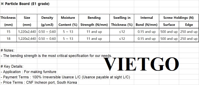 VIETGO xin gửi tới Quý nhà cung cấp thông tin về đơn hàng ván dăm đến từ vị khách hàng người Hàn Quốc tiềm năng, ông Jang.