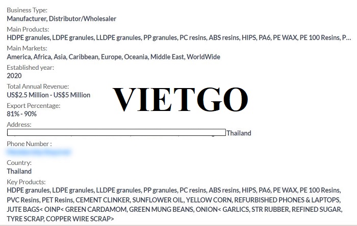 ██████████ CO., LTD. là công ty có trụ sở tại Bangkok, Thái Lan, chuyên về nhập khẩu và xuất khẩu đa dạng các sản phẩm. Công ty được thành lập vào ngày 6 tháng 12 năm 2023, với địa chỉ đăng ký tại số ██████████, Bangkok 10510. Công ty tập trung vào cung cấp các sản phẩm như giấy báo xuất bản quá hạn (OINP), hạt nhựa HDPE và PP, túi đay, đường tinh luyện và dầu ăn.
