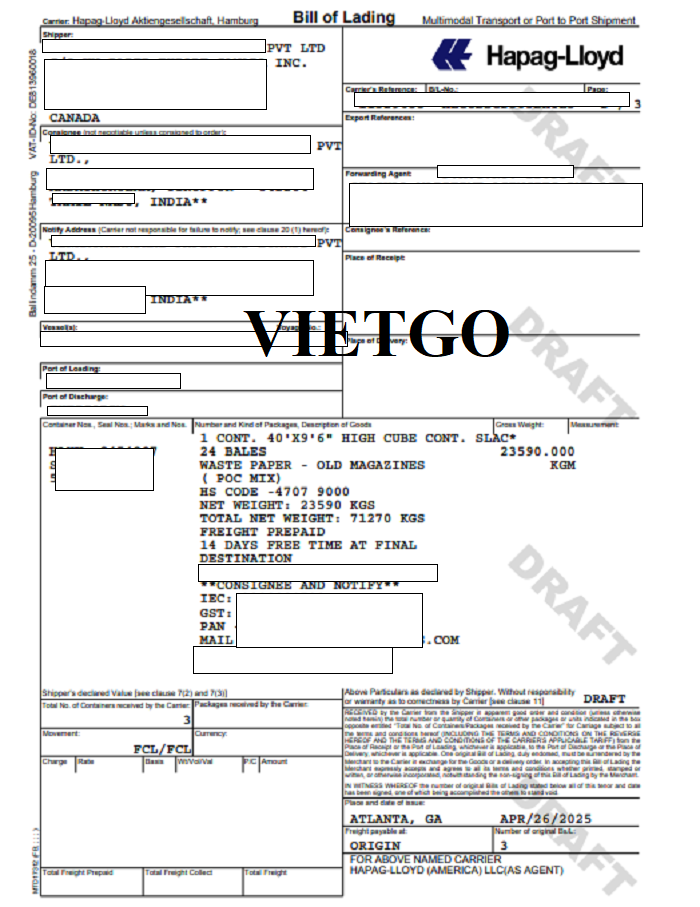 Hình ảnh bản vận đơn nhập khẩu giấy tái chế của công ty vị khách hàng từ Canada ngày 26/4/2025
