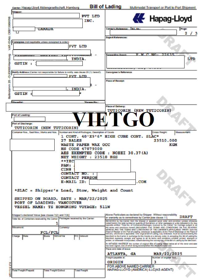 Hình ảnh bản vận đơn nhập khẩu giấy tái chế của công ty vị khách hàng từ Canada ngày 22/032025