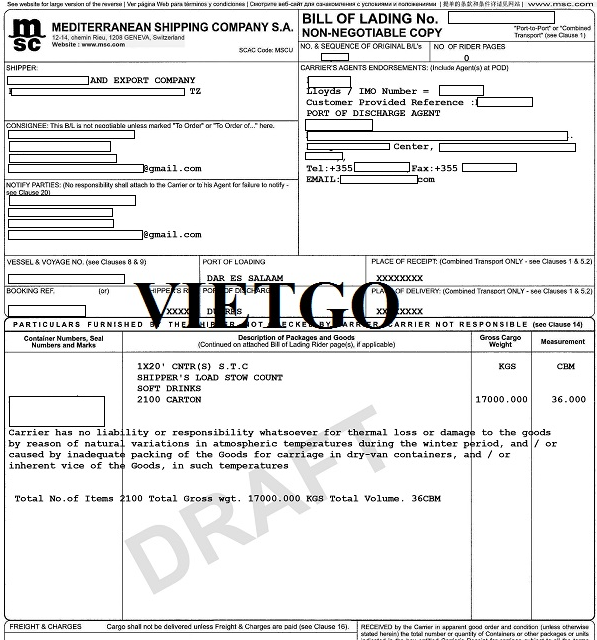 Dưới đây là hình ảnh bản vận đơn nhập khẩu thành công sản phẩm nước ngọt từ Tanzania vào ngày 18/11/2023 của công ty vị khách hàng: