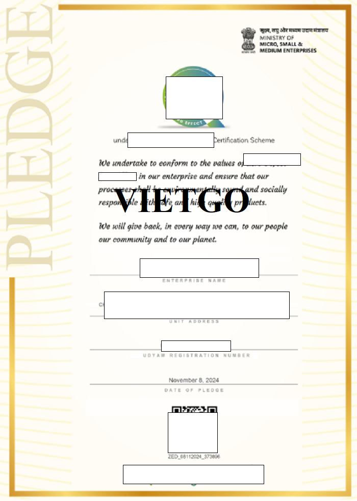 Là đơn vị được cấp chứng nhận thuộc chương trình MSME Sustainable (ZED) Certification Scheme, ██████████ cam kết sản xuất theo tiêu chuẩn "Zero Defect, Zero Effect" – tức là không lỗi trong sản phẩm và không gây ảnh hưởng xấu đến môi trường. Điều này cho thấy doanh nghiệp hướng đến việc áp dụng quy trình sản xuất bền vững, thân thiện với môi trường, đồng thời cung cấp sản phẩm nội thất gỗ đạt chất lượng cao và an toàn cho người dùng.