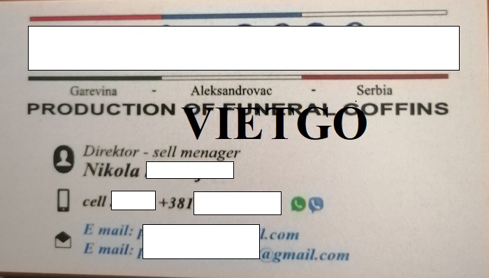 Vừa qua, ông Nikola – làm việc tại công ty ██████████ tại Serbia đã chủ động liên hệ với VIETGO nhằm mục đích nhập khẩu sản phẩm quan tài gỗ để phục vụ cho hoạt động kinh doanh của công ty mình.