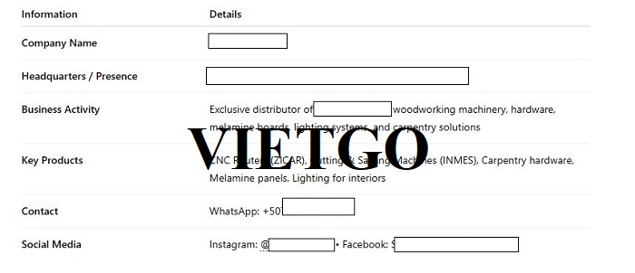 ██████████ là một nhà phân phối uy tín có trụ sở tại Panama và cũng hoạt động tại Caracas, Venezuela. Công ty là nhà phân phối độc quyền của các thương hiệu nổi tiếng như ██████████ và ██████████, chuyên cung cấp máy móc ngành gỗ, phụ kiện nội thất, ván melamine và hệ thống chiếu sáng. Với nhiều năm kinh nghiệm trong lĩnh vực nội thất và sản xuất gỗ, công ty đã xây dựng được vị thế vững chắc trên thị trường, đáp ứng nhu cầu đa dạng của khách hàng tại khu vực Mỹ Latinh.
