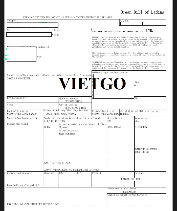 Trong hoạt động kinh doanh quốc tế, ██████████ đã có nhiều kinh nghiệm nhập khẩu hàng hóa từ các thị trường lớn như Hàn Quốc và Trung Quốc. Nhờ đó, công ty luôn đảm bảo chất lượng sản phẩm, tính ổn định trong nguồn cung và sự cạnh tranh về giá, mang lại giá trị cao cho khách hàng. Uy tín và năng lực thương mại của công ty được khẳng định thông qua các mối quan hệ hợp tác lâu dài với nhiều nhà cung cấp và đối tác quốc tế. Ông Rafael cũng đã nhập khẩu thành công nhiều đơn hàng từ các thị trường châu Á. Dưới đây là hình ảnh bản vận đơn nhập khẩu sản phẩm ván dăm ông đã nhập khẩu từ Trung Quốc tới Panama mới đây.