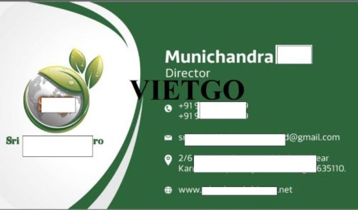 Qua thái độ nghiêm túc cùng thiện chí hợp tác tích cực, VIETGO tin rằng đây sẽ là cơ hội hứa hẹn mang đến mối quan hệ hợp tác tốt đẹp giữa ông Munichandra với người đại diện thương mại phù hợp. Ông rất mong chờ có thể tìm kiếm đối tác tin cậy cho lần hợp tác này. Quý vị nào có thể đáp ứng được các yêu cầu của vị khách hàng và quan tâm đến thương vụ hợp tác này vui lòng liên hệ với vị khách hàng theo thông tin mà chúng tôi cung cấp dưới đây trong thời gian sớm nhất.
