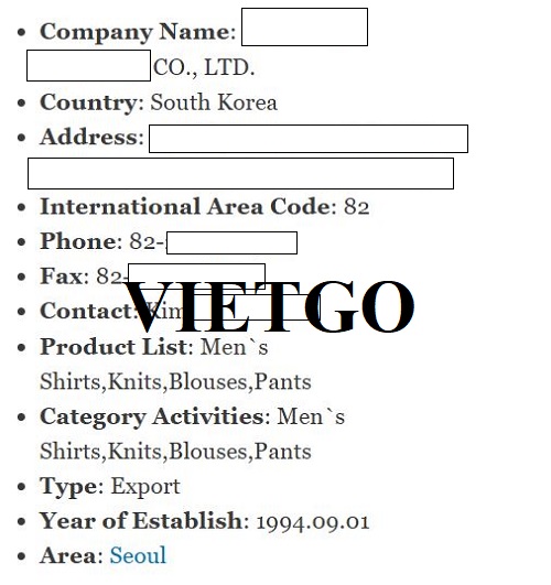 Trụ sở chính của công ty được đặt tại ██████████, Seoul. Công ty hoạt động chủ yếu theo mô hình xuất khẩu hàng may mặc, chú trọng đến chất lượng sản phẩm và dịch vụ chăm sóc khách hàng. ██████████ CO., LTD. không chỉ là nhà cung cấp đáng tin cậy trong lĩnh vực gỗ và may mặc mà còn là đối tác chiến lược lý tưởng cho các doanh nghiệp đang tìm kiếm nguồn hàng ổn định và có chất lượng cao từ Hàn Quốc.