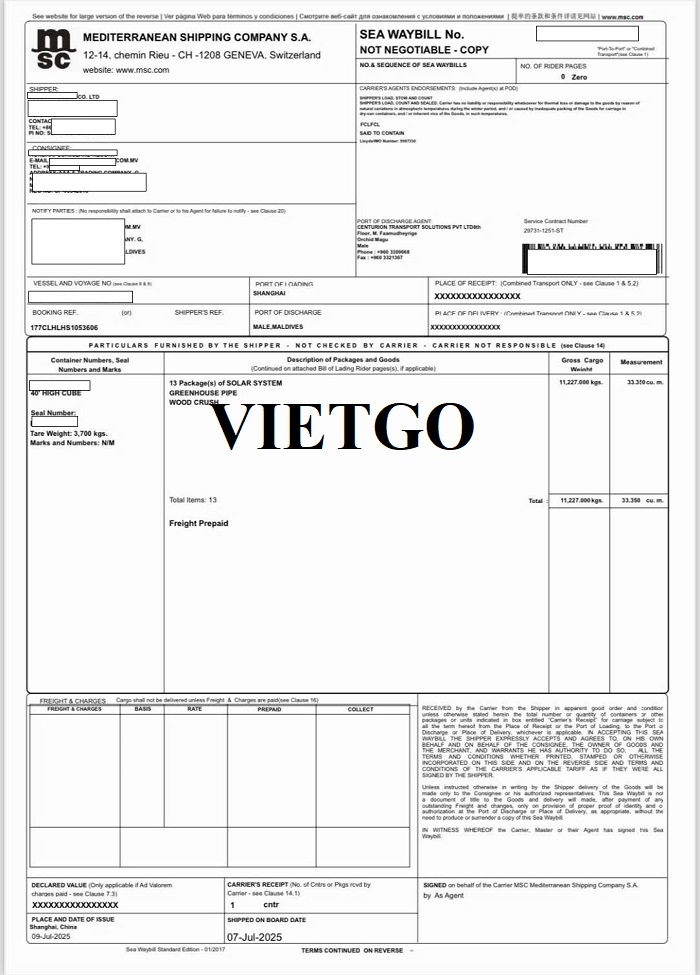 Dưới đây là hình ảnh các bản vận đơn vị khách hàng đã nhập khẩu thành công sản phẩm công ty vào ngày 7 tháng 7 năm 2025 từ cảng Shanghai, Trung Quốc đến cảng Male, Maldives.