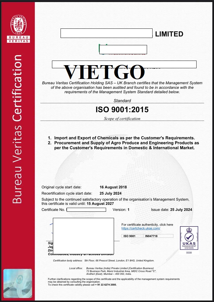 ██████████ Limited (██████████) được thành lập và bắt đầu đi vào hoạt động từ năm 1998 với 3 lĩnh vực hoạt động chính: hóa chất, sản phẩm kỹ thuật và sản phẩm nông nghiệp. Đây là bộ 3 lĩnh vực mà công ty của vị khách hàng đang vươn lên trở thành một công ty thương mại hàng đầu. ██████████ Limited được cấp giấy chứng nhận ISO 9001:2015 và vinh dự được chính phủ Ấn Độ công nhận là “NHÀ XUẤT KHẨU MỘT SAO”.