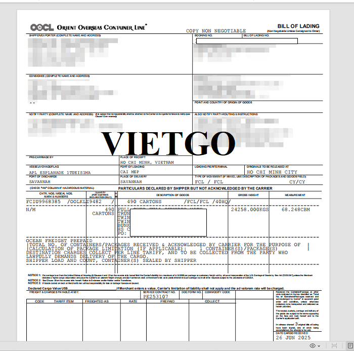 Hình ảnh bản vận đơn nhập khẩu sản phẩm giường công ty đã nhập khẩu từ Việt Nam tới thị trường Hoa Kỳ vào ngày 26 tháng 6 năm 2025