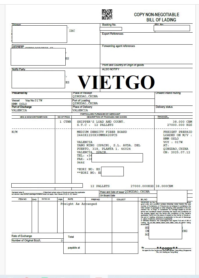 Hình ảnh bản vận đơn nhập khẩu ông Manuel đã tiến hành nhập khẩu sản phẩm ván MDF từ Trung Quốc tới Tây Ban Nha vào tháng 6 năm 2025