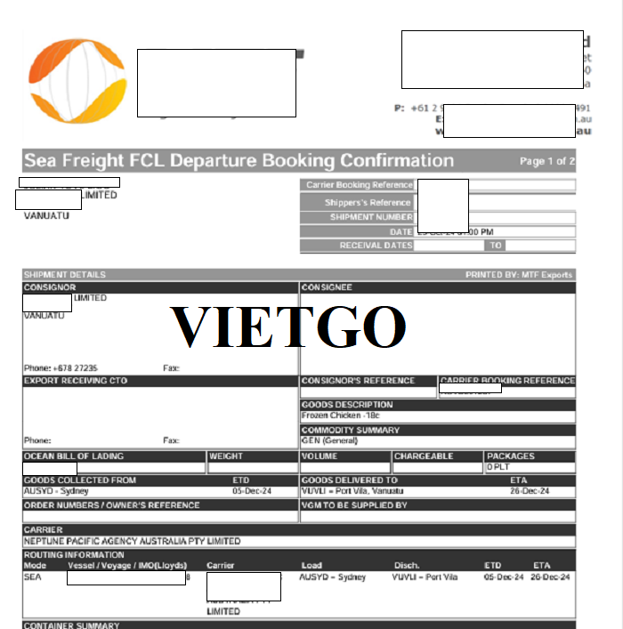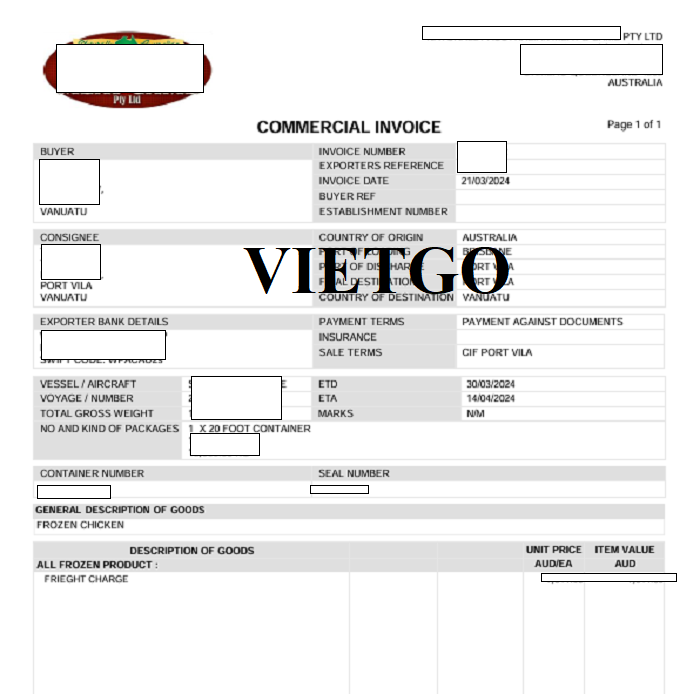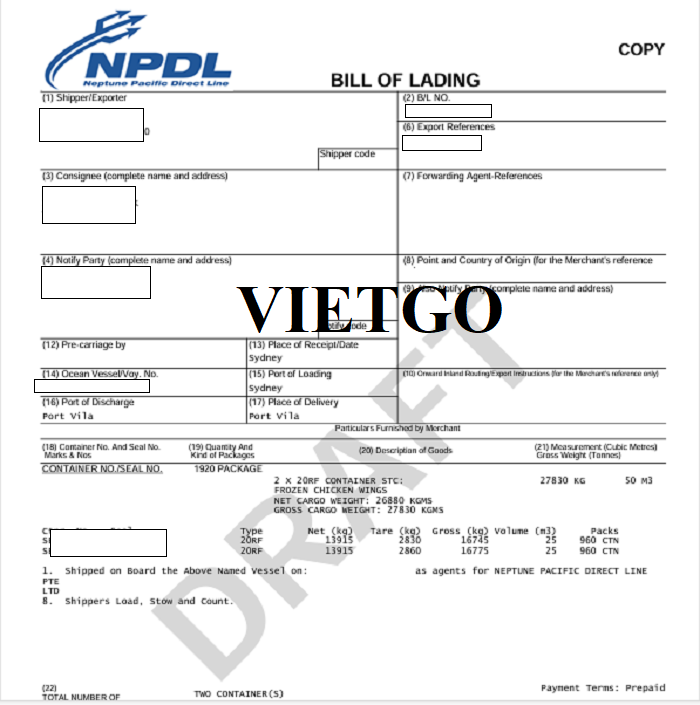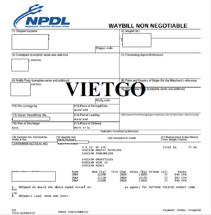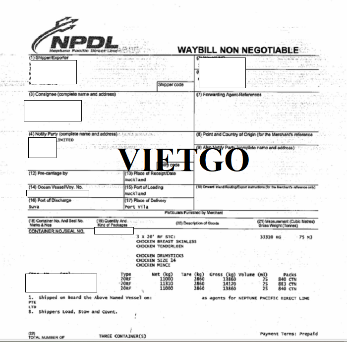 Hình ảnh bản vận đơn mặt hàng gà đông lạnh của công ty vị khách