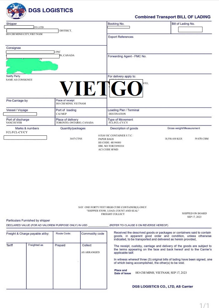 Dưới đây là hình ảnh các bản vận đơn vị khách hàng đã nhập khẩu thành công sản phẩm túi giấy từ cảng Cái Mép, Việt Nam đến cảng Vancouver, Canada.