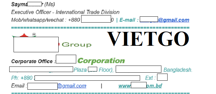 Vừa qua, cô Sayma – đại diện công ty ██████████ tại Bangladesh đã liên hệ với VIETGO bày tỏ mong muốn nhập khẩu sản phẩm giấy kraft cuộn với hy vọng sẽ hợp tác lâu dài với Quý Nhà cung cấp.