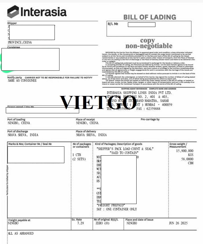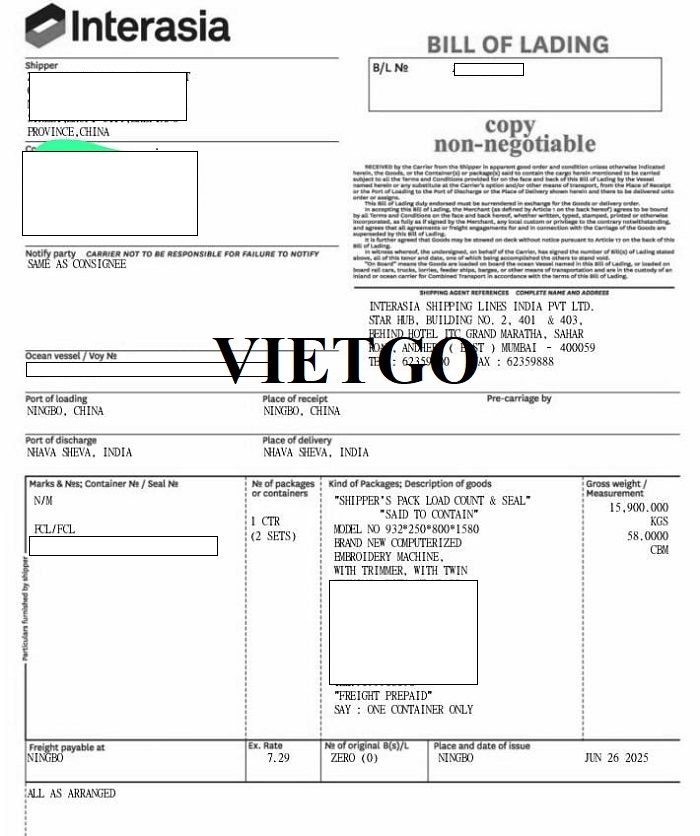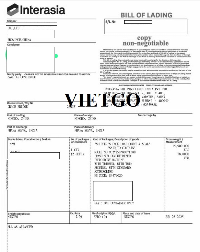 Hình ảnh vận đơn nhập khẩu máy thêu vi tính từ Trung Quốc do công ty của vị khách hàng thực hiện ngày 26/06/2025