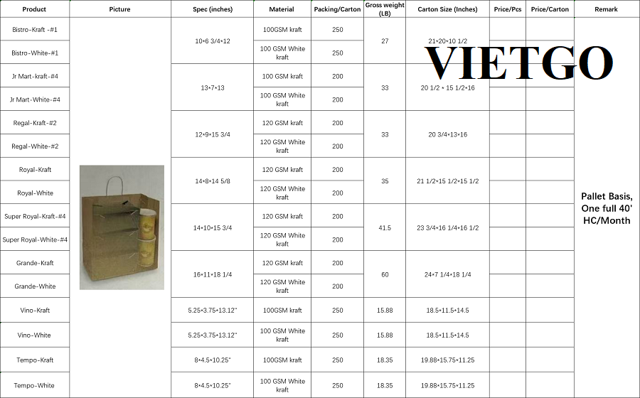 VIETGO xin gửi tới Quý nhà cung cấp thông tin chi tiết về yêu cầu đơn hàng xuất khẩu túi giấy đến từ vị khách hàng tiềm năng, ông Danny.