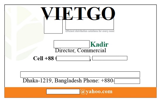 Ông Kadir mong muốn sớm nhận được báo giá từ các nhà cung cấp của VIETGO. Bởi vậy, quý nhà cung cấp nào mong muốn hợp tác với vị khách hàng vui lòng liên hệ và báo giá cho vị khách hàng trong thời gian sớm nhất theo thông tin dưới đây: