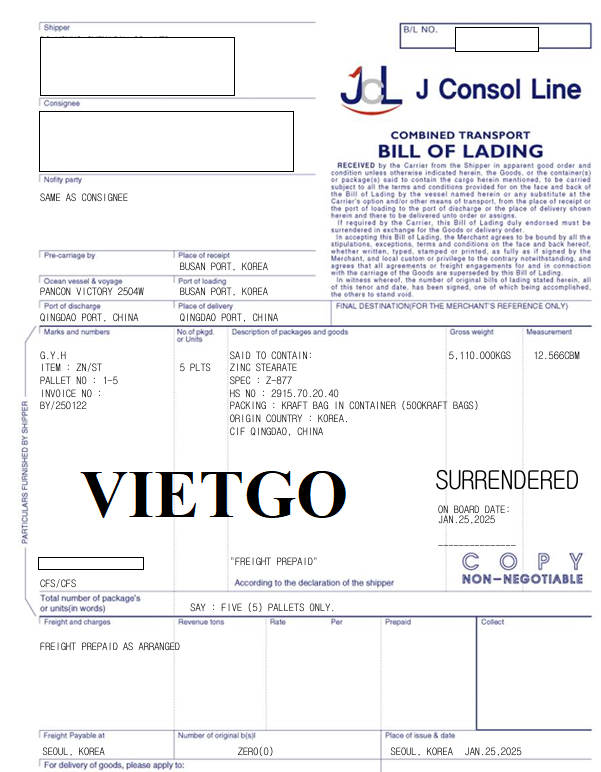 Dưới đây là hình ảnh bản vận đơn vị khách hàng đã nhập khẩu thành công sản phẩm công ty vị khách hàng đang kinh doanh vào ngày 25 tháng 1 năm 2025 từ cảng Busan, Hàn Quốc đến cảng Qingdao, Trung Quốc.