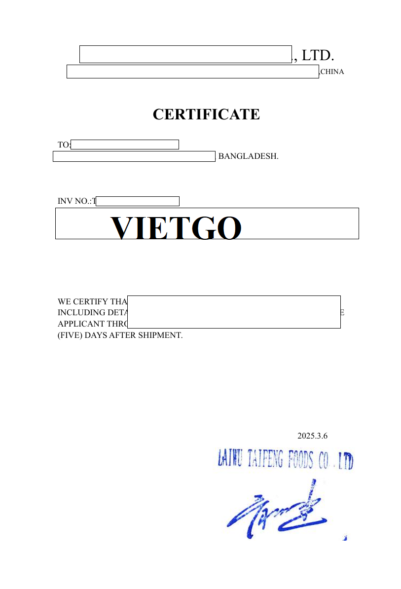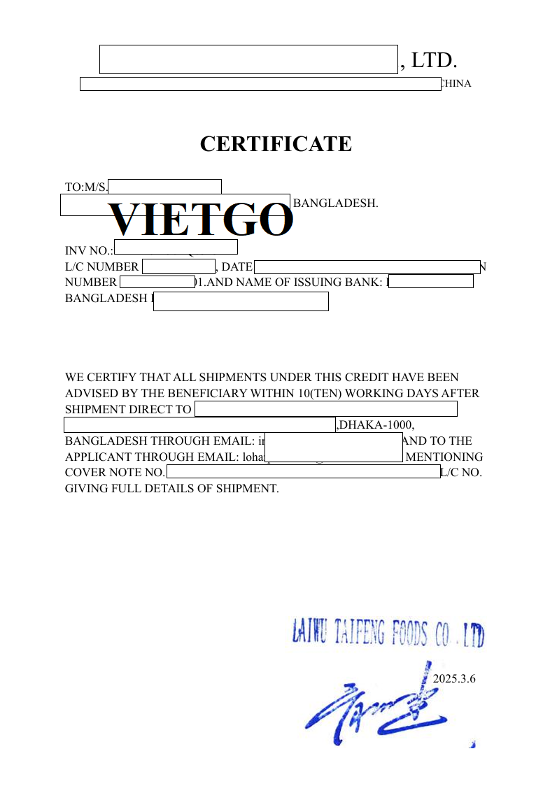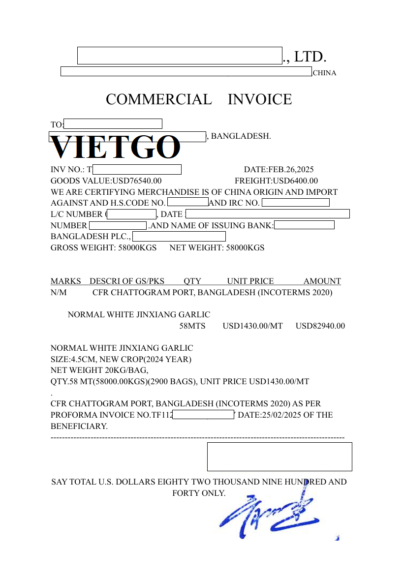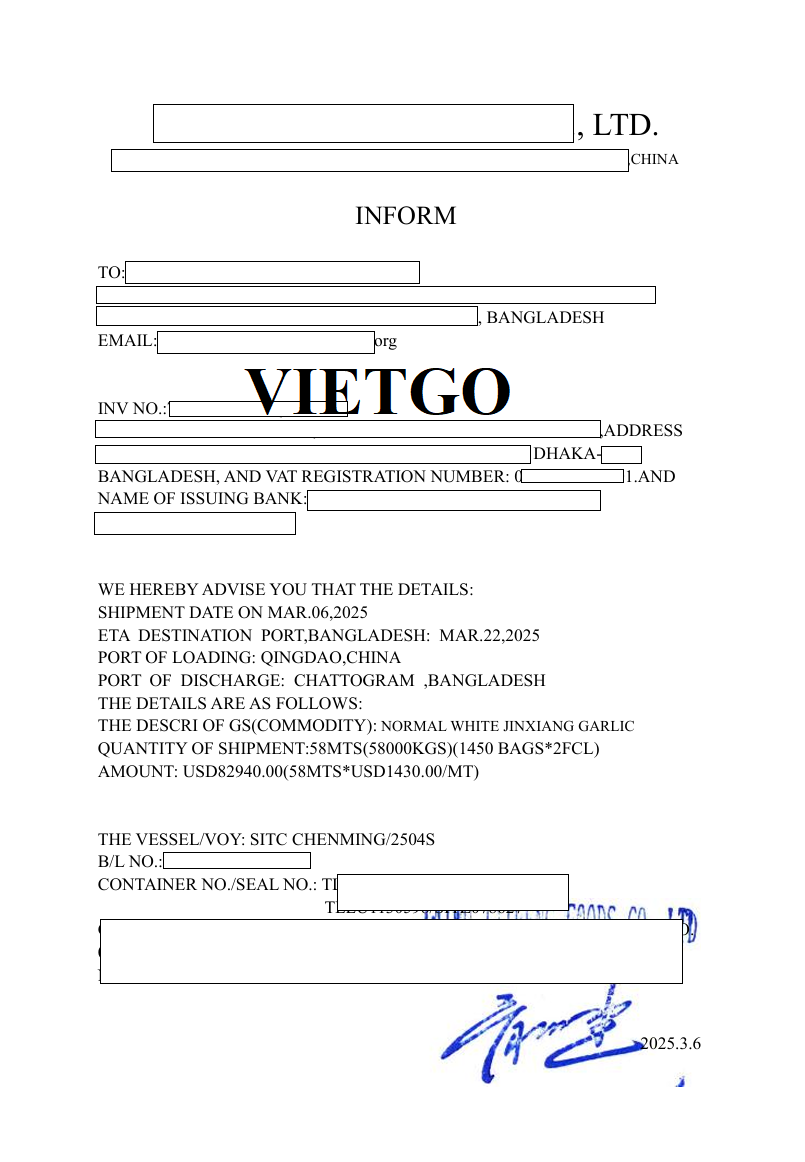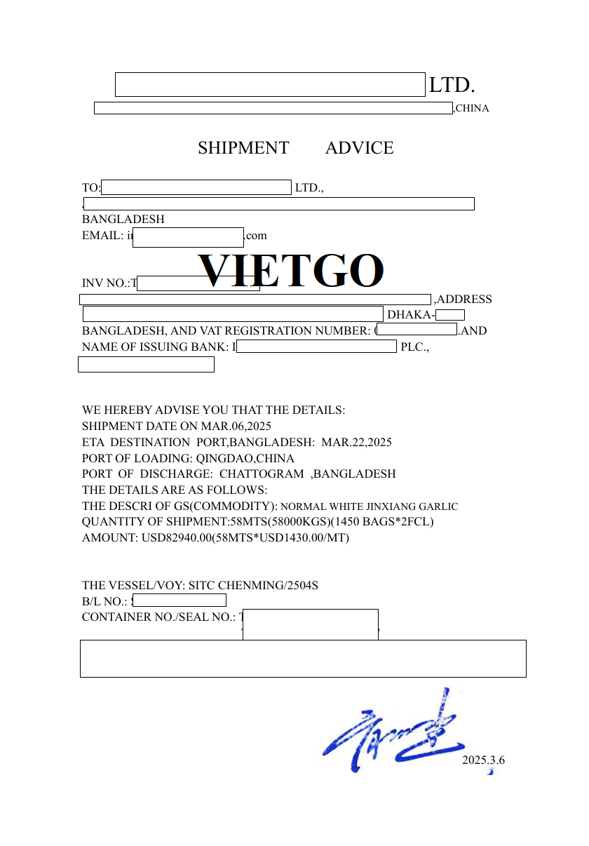 ██████████ được biết đến là doanh nghiệp có quy trình vận hành bài bản, chú trọng tính pháp lý và chất lượng sản phẩm trong suốt quá trình nhập khẩu. Việc ông Hasmat cung cấp đầy đủ các chứng từ của lô hàng tỏi từ Trung Quốc, bao gồm hóa đơn chiếu lệ, danh sách đóng gói, chứng nhận hàng hóa và hối phiếu thể hiện sự chuyên nghiệp và tuân thủ tiêu chuẩn cao của doanh nghiệp. Hoạt động kiểm soát hồ sơ kỹ lưỡng này giúp công ty giảm thiểu rủi ro, bảo đảm sản phẩm đưa ra thị trường an toàn và đúng quy định. Nhờ định hướng rõ ràng và quy trình quản lý nhất quán, ██████████ ngày càng củng cố được uy tín, tạo nền tảng vững chắc để mở rộng hợp tác với nhiều đối tác ở các quốc gia khác nhau.