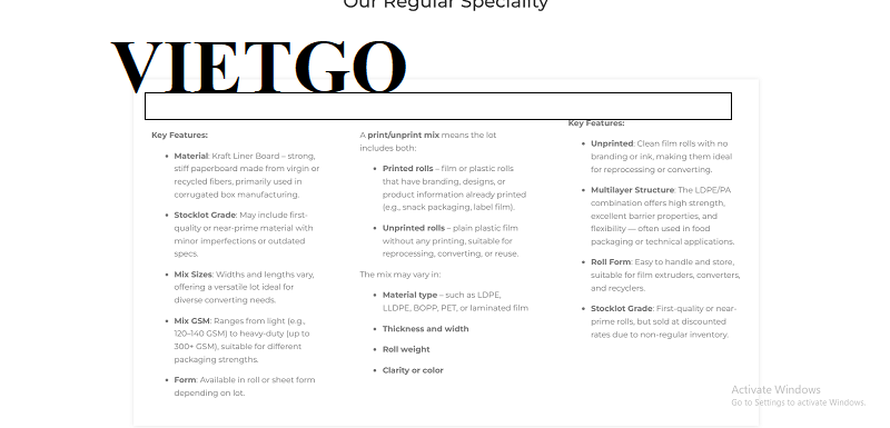 Hoạt động kinh doanh cốt lõi của ██████████ là xuất khẩu và bán buôn các cuộn nguyên liệu giấy và nhựa chất lượng, đảm bảo tiêu chuẩn ổn định và truy xuất nguồn gốc rõ ràng. Các sản phẩm mà công ty cung cấp bao gồm nhựa film cuộn, giấy cuộn các loại và nguyên liệu phim nhựa khác nhau như LDPE, LLDPE, BOPP hay PET — phù hợp với nhu cầu tái chế, chuyển đổi và sản xuất của khách hàng trên toàn cầu. ██████████ làm việc chặt chẽ với các nhà tái chế, nhà sản xuất và công ty xử lý nguyên liệu tại Bắc Mỹ, châu Á và châu Âu để thúc đẩy kinh tế tuần hoàn.