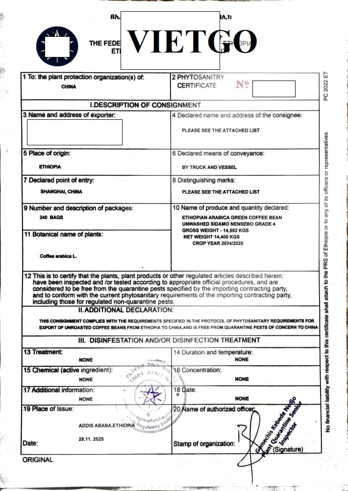 Hình ảnh giấy chứng nhận kiểm dịch thực vật của vị khách hàng