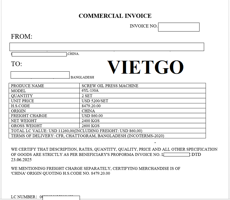 Hình ảnh hóa đơn thương mại của vị khách hàng