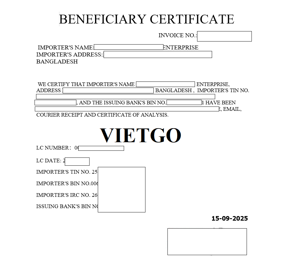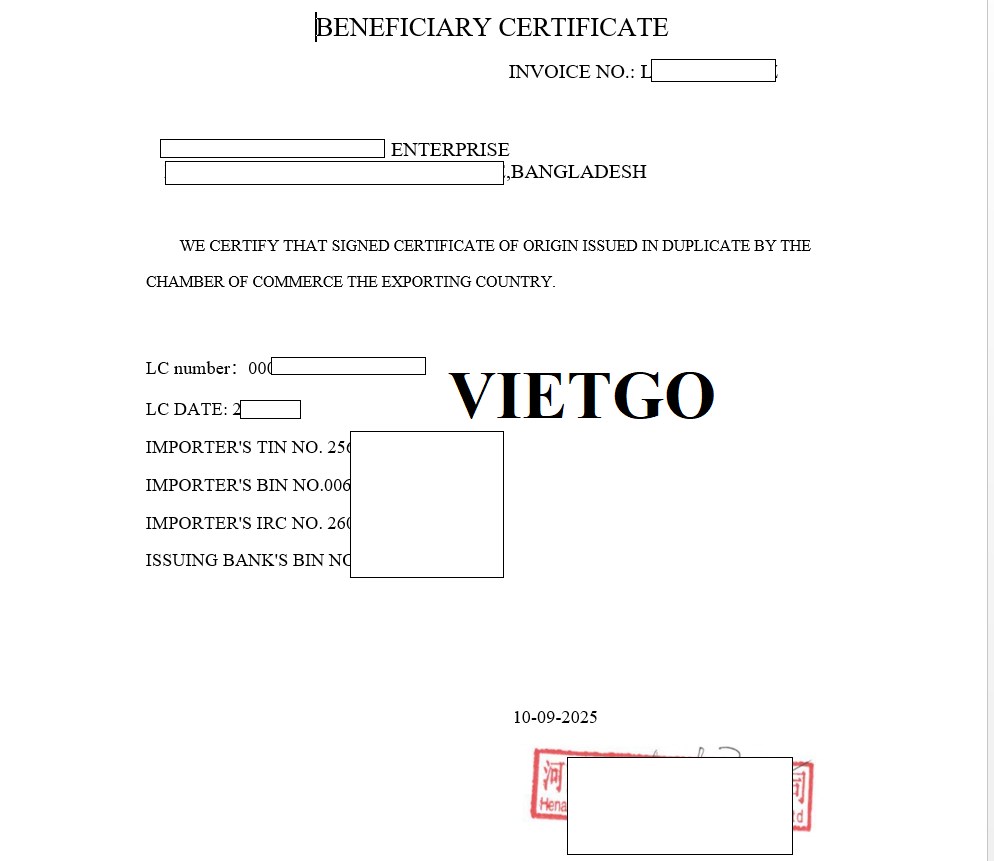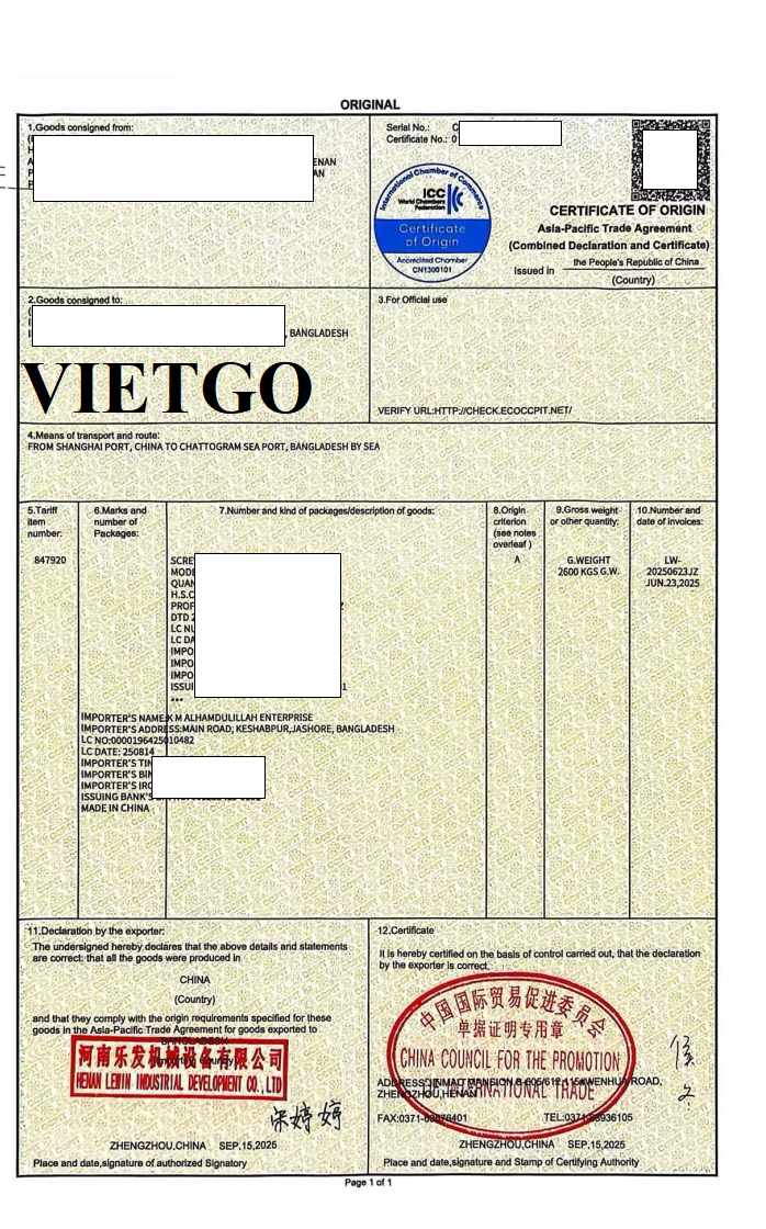 Hình ảnh chứng chỉ nguồn gốc xuất xứ của vị khách hàng
