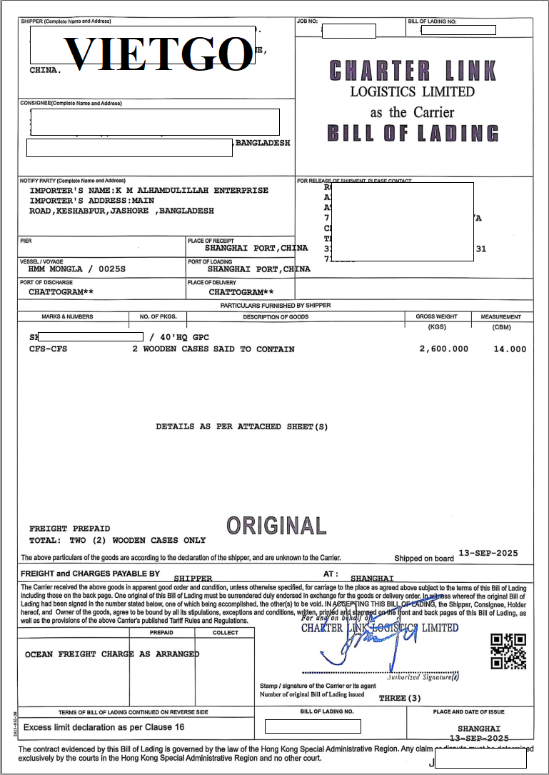 Dưới đây là hình ảnh một số giấy tờ và bản vận đơn nhập khẩu sản phẩm từ Trung Quốc của vị khách hàng vào ngày 13/09/2025:
