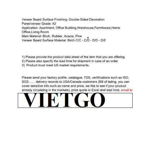 Hiện nay, đại diện ██████████ đang có nhu cầu tìm kiếm các nhà cung cấp gỗ dán tại thị trường Hoa Kỳ nhằm phục vụ kế hoạch phát triển và mở rộng hoạt động kinh doanh. Công ty mong muốn hợp tác lâu dài với các đối tác uy tín, có khả năng cung ứng ổn định, chất lượng đồng đều, giá cả cạnh tranh và đáp ứng các tiêu chuẩn kỹ thuật cũng như pháp lý của thị trường Mỹ.