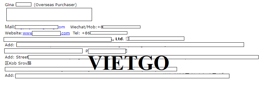 Bà Gina ██████████ là người phụ trách mua hàng quốc tế tại hệ thống doanh nghiệp thuộc tập đoàn sản xuất và phân phối sản phẩm cho thú cưng, bao gồm các đơn vị ██████████ có trụ sở tại Giang Tô, Trung Quốc; ████████████████████đặt tại Phnom Penh, Campuchia; và ██████████ tại tỉnh Preah Sihanouk. Quy mô hoạt động đa quốc gia cho thấy hệ thống các công ty mà bà đại diện có năng lực sản xuất lớn, chuỗi cung ứng rộng, cùng nhu cầu nhập khẩu nguyên liệu phục vụ hoạt động chế biến, đóng gói và phân phối tại nhiều thị trường khác nhau. Bà Gina đồng thời là đầu mối liên hệ, quản lý trao đổi thương mại với nhà cung cấp từ các quốc gia.