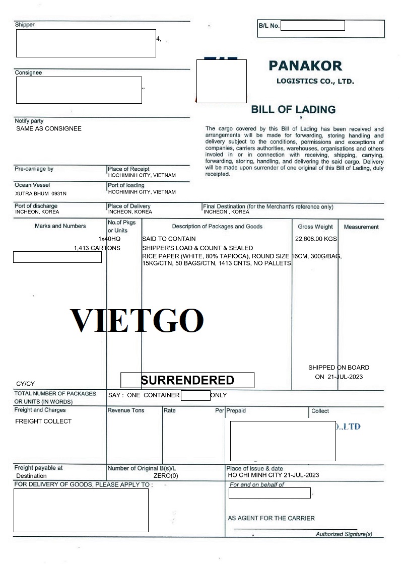 Dưới đây là hình ảnh bản vận đơn nhập khẩu bánh tráng từ Việt Nam mà vị khách hàng đã thực hiện vào 21/07/2023: