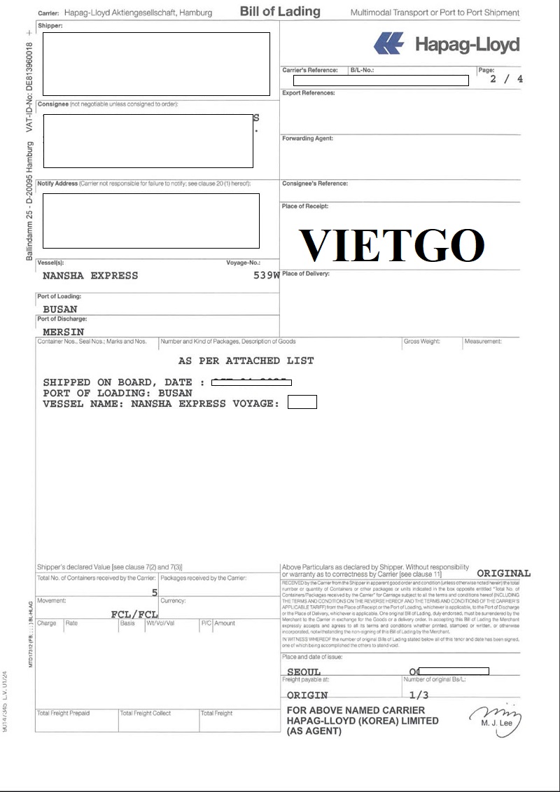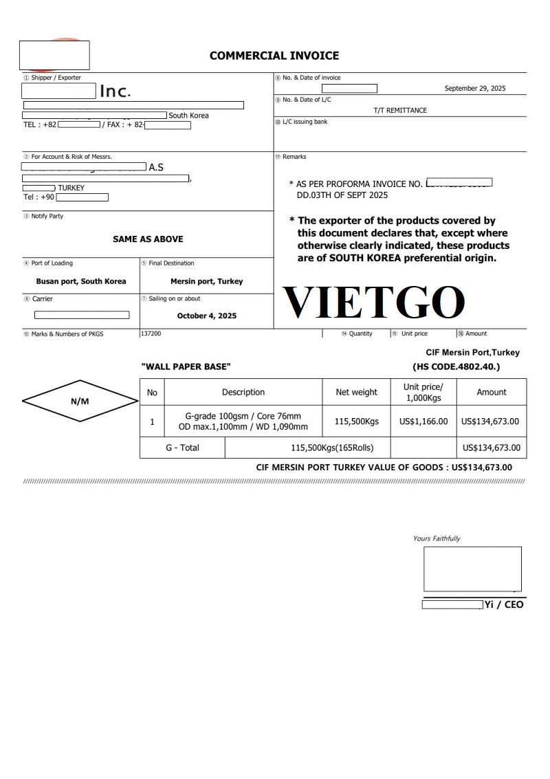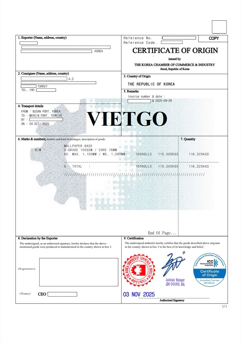 Hình ảnh vận đơn nhập khẩu giấy dán tường từ Hàn Quốc do công ty của vị khách hàng thực hiện ngày 04/10/2025