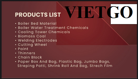 Vừa qua, VIETGO đã nhận được thông tin từ ông Vinay về nhu cầu nhập khẩu sản phẩm bao jumbo, phục vụ cho công việc kinh doanh tại thị trường Ấn Độ. Được biết, ông là đại diện đến từ công ty ██████████, đặt văn phòng hoạt động tại ██████████ ██████████, Ấn Độ. Danh mục sản phẩm của công ty rất đa dạng nhằm đáp ứng nhu cầu của nhiều ngành sản xuất và công nghiệp khác nhau. Các mặt hàng chủ lực của công ty bao gồm vật liệu lót lò hơi, hóa chất xử lý nước lò hơi, hóa chất cho tháp giải nhiệt, than sinh khối, que hàn, đá cắt, sơn công nghiệp, dung môi pha sơn, xích nâng cùng nhiều loại vật tư và giải pháp đóng gói công nghiệp. Bên cạnh đó, ██████████ còn cung cấp các sản phẩm bao bì phục vụ đóng gói và vận chuyển hàng hóa số lượng lớn như thùng giấy, túi giấy, túi nhựa, bao jumbo, dây đai đóng gói, màng co và màng quấn.